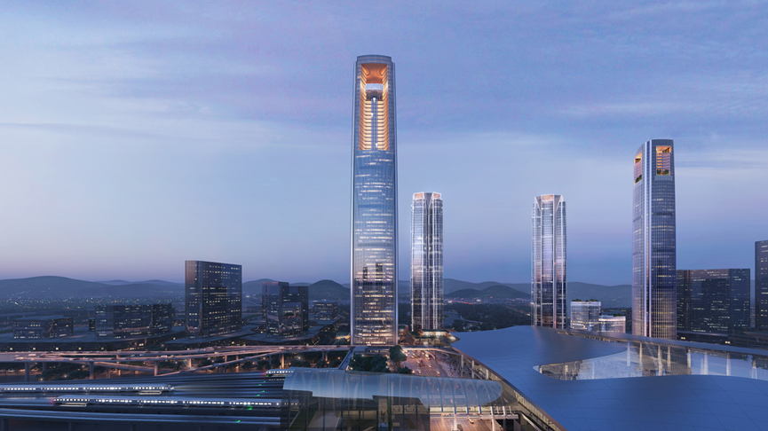 杭州西站枢纽站北综合体建筑面积约60万方,项目集办公、商业、酒店、云端观景等功能,建成后将为站城一体、功能复合的超级TOD典范。其中400米塔楼将成为杭州市第一高楼。