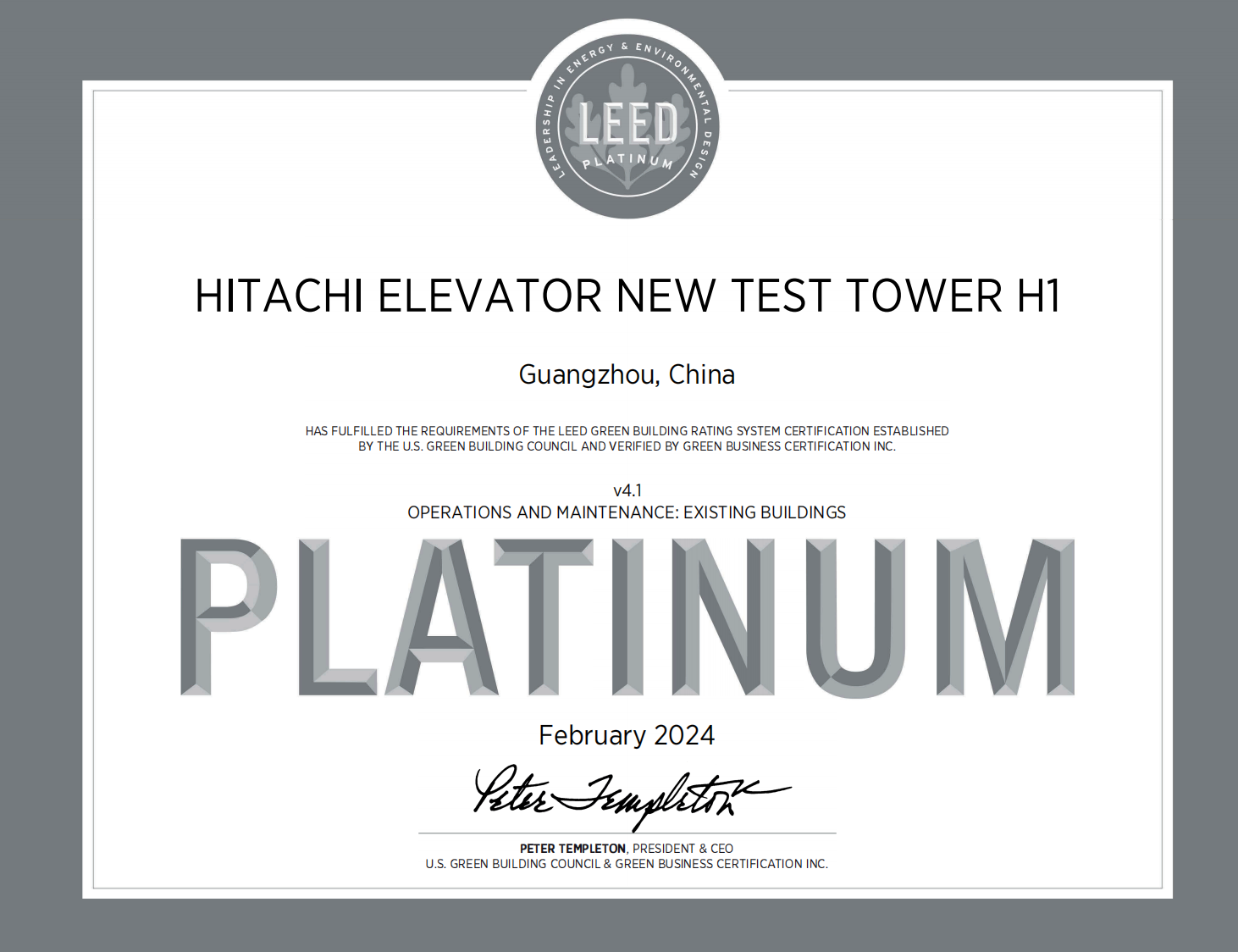 近日,日立电梯H1 Tower试验塔获得由美国绿色建筑委员会(USGBC)颁发的LEED O+M(运营与维护)最高级别——铂金级认证。